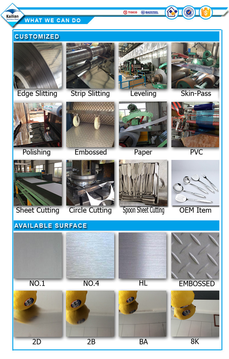We can provide you cold rolled stainless steel in your Customized Specifications, including: 409 stainless steel coils, 409 stainless steel sheets, 410 stainless steel coils, 410 stainless steel sheets, 410 stainless steel strips, 410 stainless steel circles, 430 stainless steel coils, 430 stainless steel sheets, 430 stainless steel strips, 430 stainless steel circles, 201 stainless steel coils, 201 stainless steel sheets, 201 stainless steel strips, 201 stainless steel circles and embossed stainless steel coils and sheets.